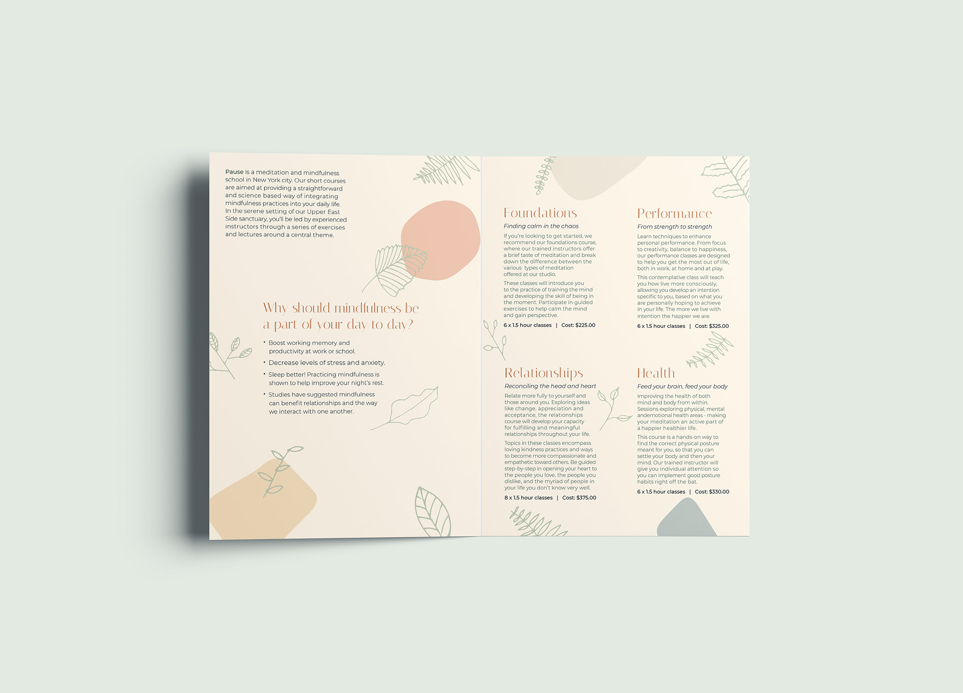 Brochure and merchandise for a mindfulness and meditation school in the Upper East Side, NYC. For this project, I used hand-drawn organic shapes with elements from nature and earthy colors.